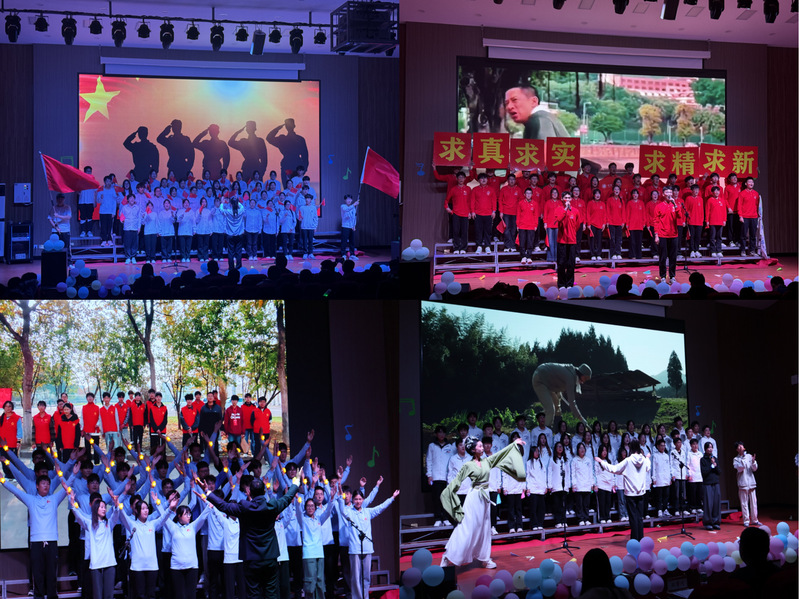 比赛现场,来自全校各学院以班级为单位的14支参赛队伍,不拘泥于传统合唱方式,在合唱基础上融合了朗诵、情景表演、舞蹈、乐器等多种表演形式,使得合唱表演耳目一新,极具观赏性和创新性,展现出每支参赛队伍独特的文化和特色。每个参赛选手以饱满的热情和昂扬的状态投入到合唱表演中,生动演绎出了青春歌曲的独特魅力。《奔跑》《骄傲的少年》《未来我来》等追梦歌曲,呈现出当代青年奋发向上的活力,勇于锤炼出坚强、热血、斗志昂扬的品质。《稻香》《海阔天空》《做自己的光,不需要太亮》等励志歌曲,鼓舞青年人在面对逆境时,不畏艰险,展现奋勇拼搏的新时代青年风采。最后一首《橡现场工程师之歌》,更是体现出了在材料工程领域里,有这样一群充满活力与激情的时代青年,他们用青春热血,投身于橡胶工程的现场,书写着属于他们的奋斗篇章……各参赛队以其饱满昂扬的姿态、基础扎实的唱功、绚丽多彩的表演给观众带来了一场视听盛宴,赢得师生阵阵喝彩。